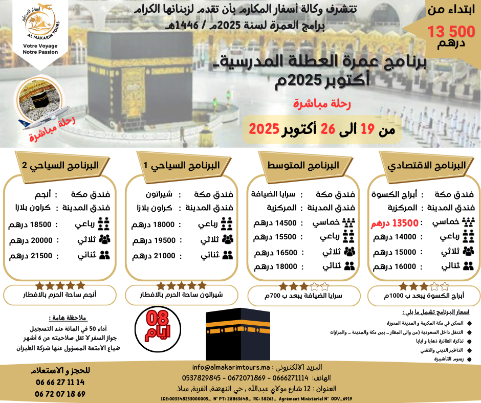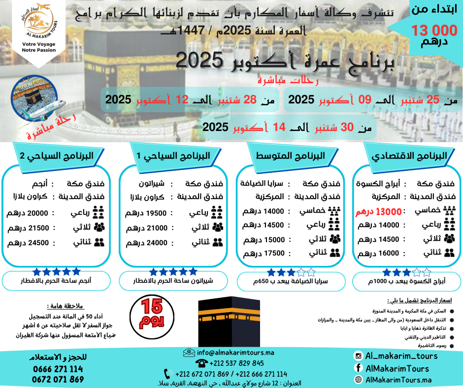 ثمن عمرة أكتوبر 2025 من المغرب مع وكالة أسفار المكارم لخدمات الحج والعمرة يبدأ من 10000 درهم فقط للفرد الواحد في الغرفة الخماسية بفندق أبراج الكسوة او تيسير الخيمة شاملة لكل المصاريف، للحجز تواصلوا معنا على0666271114.