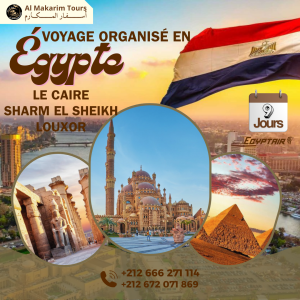 Voyage Organisé en Égypte - 9 Jrs - Le Caire/Charm EL Cheikh à partir de 13950 DH Day 1 : CASABLANCA - LE CAIRE 20h00 : Rassemblement à l'aéroport Mohammed V de Casablanca pour votre voyage organisé en Égypte à partir du Maroc. 23h00 : Enregistrement et embarquement pour votre vol direct vers Le Caire. Day 2 : L'arrivée au Caire et Dîner Croisière sur le Nil 🌃 07h40 : Arrivée à l'aéroport international du Caire. Accueil par votre représentant. Transfert vers hôtel Hyatt Regency Cairo West 5★ au Caire. Votre guide touristique vous expliquera les détails du programme et vous fera faire une visite à pied pour vous familiariser avec les environs de l'hôtel, suivie d'une visite à un bureau de change. Temps libre pour vous détendre à l'hôtel et profiter de ses installations (piscine, etc.). Déjeuner dans un restaurant local. (libre) En soirée, profitez d'une soirée inoubliable à bord d'un bateau 5 étoiles avec un dîner-buffet ouvert et un spectacle folklorique (danse du ventre, derviches tourneurs, musique traditionnelle et derviches). (Cadeau de l'agence) Nuitée à l'hôtel. Day 3 : À la Rencontre des Pyramides et du Sphinx 🏛️ Petit-déjeuner à l'hôtel (inclus) Visite des pyramides de Gize (Khéops, Khéphren, Mycérinus) et du Sphinx (inclus) Déjeuner dans un restaurant local (libre) Découverte des secrets de leur construction et de la civilisation pharaonique lors de la visite de l'Institut du Papyrus Dîner dans un restaurant local (libre) Nuitée à l'hôtel Day 4 : Le Caire Historique et Islamique 🕌 Petit-déjeuner à l'hôtel (inclus) Découverte du Musée Égyptien Déjeuner dans un restaurant local (libre) Exploration du quartier islamique : la Mosquée Hussein et le souk de Khan El Khalili. Balade dans la rue historique d'Al-Muizz. Déjeuner dans un restaurant local (libre) Nuitée à l'hôtel Day 5 : LE CAIRE / Sharm - De la Folie Urbaine au Paradis Tropical de la Mer Rouge 🛫 Petit-déjeuner à l'hôtel (inclus) Départ à l'aéroport du Caire pour un vol domestique vers Charm El-Cheikh (inclus) Transfert à l'hôtel Dream Beach Resort & Spa 5★ et installation Déjeuner à l'hôtel (inclus) Temps libre pour profiter de la plage et des installations de l'hôtel Dîner à l'hôtel (inclus) Nuitée à l'hôtel Day 6 : Charm El-Cheikh - Détente ou Exploration Marine 🌊 Petit-déjeuner à l'hôtel (inclus) Journée libre pour profiter de la plage et des installations de l'hôtel Déjeuner à l'hôtel ou durant l'Excursion (inclus) En Option :Excursion marine à Ras Mohamed et l'Île Blanche avec plongée et snorkeling. Dîner à l'hôtel (inclus) Nuitée à l'hôtel Day 7 : Charm El-Cheikh - Détente ou Aventure Aquatique 🐬 Petit-déjeuner à l'hôtel (inclus) Journée libre pour profiter de la plage et des installations de l'hôtel Déjeuner à l'hôtel ou durant l'Excursion (inclus) En Option : Sortie en sous-marin pour admirer les fonds marins ou spectacle de dauphins. Dîner à l'hôtel (inclus) Nuitée à l'hôtel Day 8 : Charm El-Cheikh - Détente ou Safari dans le Désert 🏜️ Petit-déjeuner à l'hôtel (inclus) Journée libre pour profiter de la plage et des installations de l'hôtel Déjeuner à l'hôtel (inclus) En Option : Safari dans le désert avec visite du vieux souk, de Soho Place et du Farsha Café. Dîner à l'hôtel (inclus) Nuitée à l'hôtel Day 9 : Retour au Maroc, des Souvenirs Plein la Tête 🛬 Petit-déjeuner à l'hôtel (inclus) Transfert à l'aéroport de Charm El-Cheikh pour le vol retour vers Le Maroc Vol de retour vers Casablanca avec escale au Caire. Fin de ce merveilleux Voyage Organisé en Égypte à partir du Maroc.